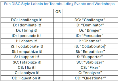 These DiSC style labels are just for fun and can be used in a variety of ways in teambuilding settings. You can create buttons, t-shirts, hats, placards or other items for each style label. Then give them out to each person, corresponding to their DiSC style, as they enter a teambuilding event (live or virtually). Ask them to think of ‘fun example or two’ of how that style label fits them in how they approach their work. They should be ready to share with the group during the exercise.